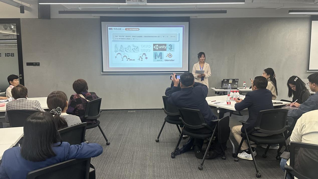 随后,我校姚陈静老师以《AI 赋能游戏动画教育 —— 以〈游戏动画制作〉课程为例》带来专业分享。作为专业核心课程,该课程融合《动画制作员国家职业标准》与行业需求,构建 “原理→角色→集成” 三阶段递进式教学体系。姚老师详细解读:通过 AI 姿态比对系统、动画质量诊断工具,课程实现运动规律验证、角色动画制作与引擎集成的智能化教学;同时践行 “跨学科融合”“神形并驱” 理念 —— 既夯实动画原理、关键帧思维等 “神” 之核心能力,又灵活适配 Blender、Unity 等 “形” 之工具载体。干货满满地分享,让在场嘉宾清晰把握 AI 与职教课程的融合路径。