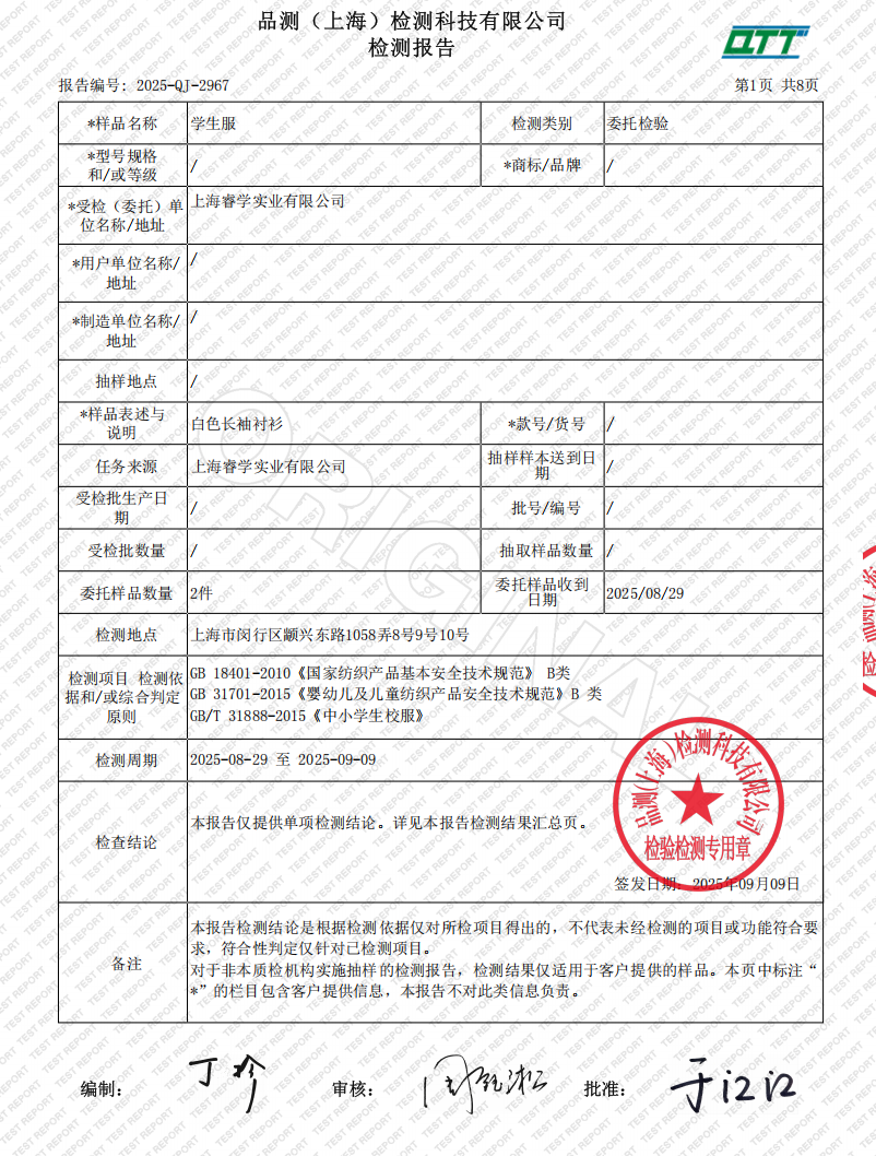 2025级新生校服双检报告(企业+学校)网上公示(衬衫)